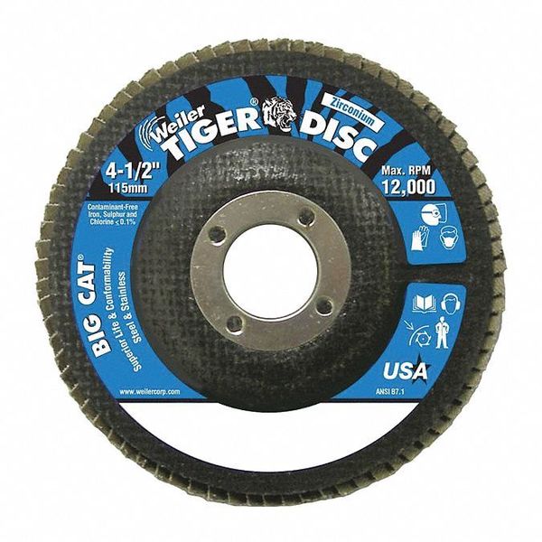 SKU G2676339Categories Abrasives & PolishersDescription Flap Disc, Abrasive Type Coated, Abrasive Material Zirconia Alumina, Grade Medium, Backing Plate Material Phenolic, Connector Size 7/8 in, Connector Type Unthreaded Hole, Density Rating High, Flap Disc Type Type 27, Overall Diameter 4 1/2 in, Series Tiger Big Cat HD, Backing Material Phenolic, Grit 60, Maximum Operating Speed 12,000 RPM, Color BluegraingerSKU: 36RD12, mscSKU: , zoro_no: G2676339, mongo_id: 65bbe9ec22d7a989a9985896