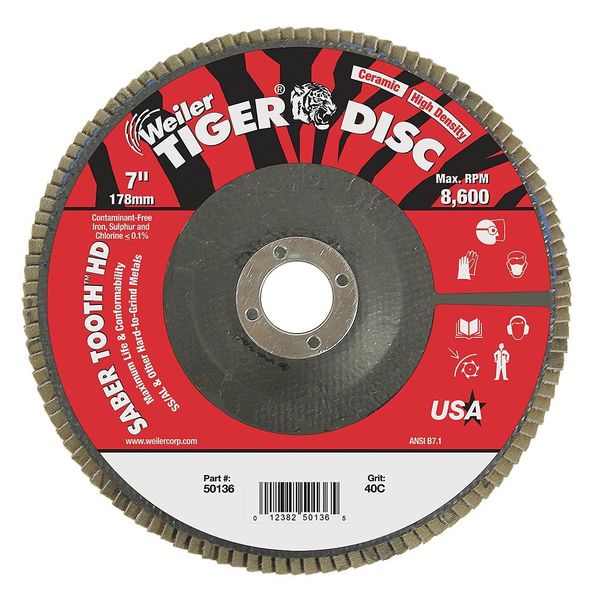 $22.81 / eachWeb price7" Tiger Ceramic High Density (TY27) Abrasive 40C 7/8" Arbor HoleSKU G0174730Categories Abrasives & PolishersDescription Flap Disc, Abrasive Type Coated, Abrasive Material Ceramic, Grade Coarse, Backing Plate Material Phenolic, Connector Size 7/8 in, Connector Type Unthreaded Hole, Density Rating High, Flap Disc Type Type 27, Overall Diameter 7 in, Series Tiger Ceramic HD, Backing Material Phenolic, Grit 40, Maximum Operating Speed 8,600 RPM, Color Red, Features Performance CoatedgraingerSKU: 38UZ48, mscSKU: , zoro_no: G0174730, mongo_id: 65bbe92f22d7a989a993da03