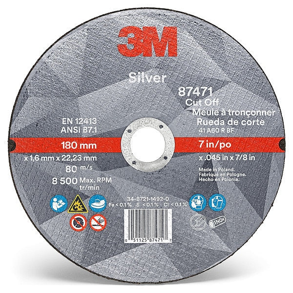 SKU G4422743Categories Abrasives & PolishersDescription Abrasive Cut-Off Wheel, Abrasive Material Ceramic, Grit 60, Connector Size 7/8 in, Connector Type Unthreaded Hole, Overall Diameter 7 in, Overall Thickness 0.045 in, Compatible Tool Type Angle Grinder, Primary Material Applicationn Stainless Steel, Steel, Series Silver, Wheel Type Type 1, Maximum Operating Speed 8,500 RPM, Color BlackgraingerSKU: 450Y36, mscSKU: , zoro_no: G4422743, mongo_id: 65bbe7393aaddbd5a90819a2