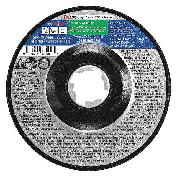 SKU G3882829Categories Abrasives & PolishersDescription Depressed Center Grinding Wheel, Abrasive Material Silicon Carbide, Connector Size 7/8 in, Connector Type X-Lock, Grit 24, Overall Diameter 4 1/2 in, Overall Thickness 0.25 in, Primary Material Applicationn Stainless Steel, Steel, Compatible Tool Type Angle Grinder, Series X-LOCK, Wheel Type Type 27, Maximum Operating Speed 13,280 RPMgraingerSKU: 54ZT82, mscSKU: , zoro_no: G3882829, mongo_id: 65bbe7a79a749db82274ce97
