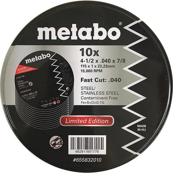 SKU G210445193Categories Abrasives & PolishersDescription Abrasive Cut-Off Wheel, Abrasive Material Ceramic, Grit 36, Connector Size 7/8 in, Overall Diameter 4 1/2 in, Overall Thickness 0.045 in, Compatible Tool Type Angle Grinder, Cut-Off Tool, Primary Material Applicationn Stainless Steel, Series Not Applicable, Wheel Type Type 1, Specification Not Applicable, Maximum Operating Speed 13,300 RPM, Reinforced Status 2-Layer Reinforced$13.06 / eachWeb priceAbrasive Cut-Off Wheel, 7/8 in ConnectorSKU G210445193Categories Abrasives & PolishersDescription Abrasive Cut-Off Wheel, Abrasive Material Ceramic, Grit 36, Connector Size 7/8 in, Overall Diameter 4 1/2 in, Overall Thickness 0.045 in, Compatible Tool Type Angle Grinder, Cut-Off Tool, Primary Material Applicationn Stainless Steel, Series Not Applicable, Wheel Type Type 1, Specification Not Applicable, Maximum Operating Speed 13,300 RPM, Reinforced Status 2-Layer Reinforced$13.06 / eachWeb price -