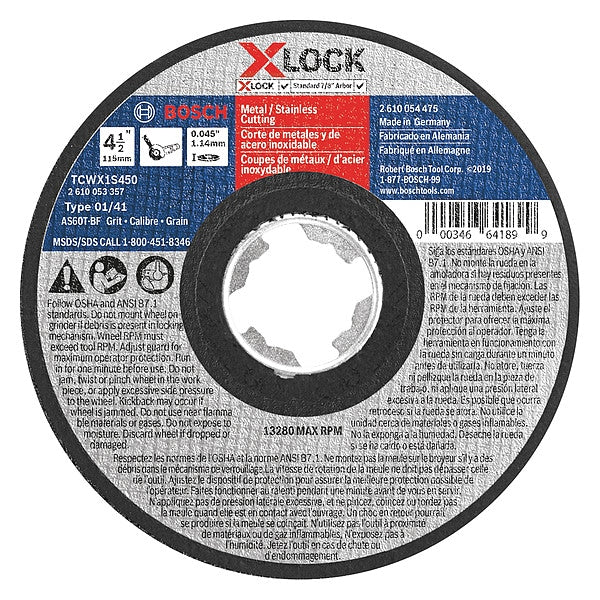 SKU G3882740Categories Abrasives & PolishersDescription Abrasive Cut-Off Wheel, Abrasive Material Aluminum Oxide, Grit 60, Connector Size 7/8 in, Connector Type X-Lock, Overall Diameter 4 1/2 in, Overall Thickness 0.045 in, Compatible Tool Type Angle Grinder, Primary Material Applicationn Stainless Steel, Steel, Series X-LOCK, Wheel Type Type 1, Maximum Operating Speed 13,280 RPM, Bond Type ResingraingerSKU: 54ZT79, mscSKU: , zoro_no: G3882740, mongo_id: 65bbe8e822d7a989a9923a1d
