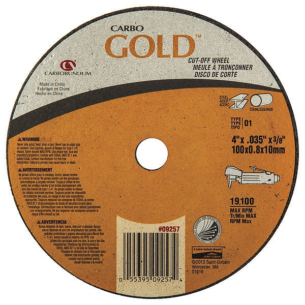 SKU G4428608Categories Abrasives & PolishersDescription Abrasive Cut-Off Wheel, Abrasive Material Aluminum Oxide, Grit 60, Connector Size 3/8 in, Connector Type Unthreaded Hole, Overall Diameter 4 in, Overall Thickness 0.035 in, Compatible Tool Type Die Grinder, Primary Material Applicationn Cast Iron, Steel, Series Carbo Gold, Wheel Type Type 1, Maximum Operating Speed 19,100 RPM, Reinforced Status Reinforced, Bond Type Resin$1.68 / eachWeb priceAbrasive Cut-Off Wheel, Type 41, 4" dia.SKU G4428608Categories Abrasives & PolishersDescription Abrasive Cut-Off Wheel, Abrasive Material Aluminum Oxide, Grit 60, Connector Size 3/8 in, Connector Type Unthreaded Hole, Overall Diameter 4 in, Overall Thickness 0.035 in, Compatible Tool Type Die Grinder, Primary Material Applicationn Cast Iron, Steel, Series Carbo Gold, Wheel Type Type 1, Maximum Operating Speed 19,100 RPM, Reinforced Status Reinforced, Bond Type Resin$1.68 / eachWeb price -