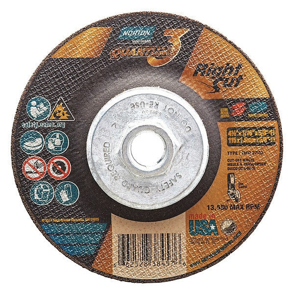 SKU G7951503Categories Abrasives & PolishersDescription Depressed Center Cut-Off Wheel, Abrasive Material Ceramic, Connector Size 5/8 In.-11, Connector Type Threaded Hole, Grit 36, Overall Diameter 4 1/2 in, Overall Thickness 0.0625 in, Primary Material Applicationn Stainless Steel, Steel, Compatible Tool Type Angle Grinder, Series Quantum 3 RightCut, Wheel Type Type 27, Maximum Operating Speed 13,580 RPM, Grade Very CoarsegraingerSKU: 54YL92, mscSKU: 11279080, zoro_no: G7951503, mongo_id: 65bbe8c922d7a989a99152ee