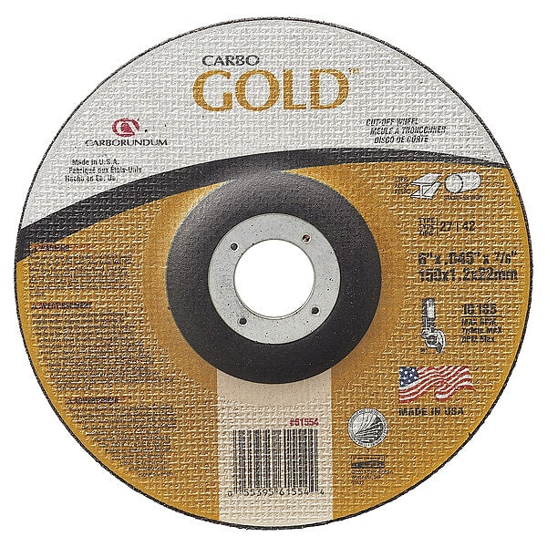 SKU G600528376Categories Abrasives & PolishersDescription Depressed Center Cut-Off Wheel, Abrasive Material Aluminum Oxide, Connector Size 7/8 in, Connector Type Unthreaded Hole, Grit 30, Overall Diameter 6 in, Overall Thickness 0.045 in, Primary Material Applicationn Steel, Compatible Tool Type Angle Grinder, Series Carbo Gold Cut, Wheel Type Type 27, Maximum Operating Speed 10,185 RPMgraingerSKU: , mscSKU: , zoro_no: G600528376, mongo_id: 65bbe6af3aaddbd5a90483ae