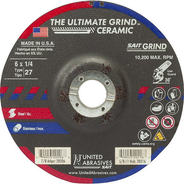 SKU G309753826Categories Abrasives & PolishersDescription Abrasive Grinding Wheel, Abrasive Material Ceramic, Connector Size 7/8 in, Connector Type Unthreaded Hole, Grit 24, Overall Diameter 6 in, Overall Thickness 0.25 in, Primary Material Applicationn Stainless Steel, Steel, Compatible Tool Type Angle Grinder, Series Ultimate Grind Ceramic, Wheel Type Type 27$22.11 / eachWeb priceAbrasive Grinding WheelSKU G309753826Categories Abrasives & PolishersDescription Abrasive Grinding Wheel, Abrasive Material Ceramic, Connector Size 7/8 in, Connector Type Unthreaded Hole, Grit 24, Overall Diameter 6 in, Overall Thickness 0.25 in, Primary Material Applicationn Stainless Steel, Steel, Compatible Tool Type Angle Grinder, Series Ultimate Grind Ceramic, Wheel Type Type 27$22.11 / eachWeb price