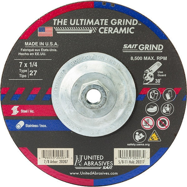 SKU G209753827Categories Abrasives & PolishersDescription Abrasive Grinding Wheel, Abrasive Material Ceramic, Connector Size 5/8 In.-11, Connector Type Threaded Hole, Grit 24, Overall Diameter 7 in, Overall Thickness 0.25 in, Primary Material Applicationn Stainless Steel, Steel, Compatible Tool Type Angle Grinder, Series Ultimate Grind Ceramic, Wheel Type Type 27graingerSKU: , mscSKU: , zoro_no: G209753827, mongo_id: 65bbe6043aaddbd5a9000c00