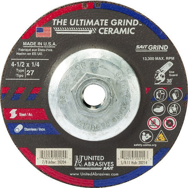 SKU G709753839Categories Abrasives & PolishersDescription Abrasive Grinding Wheel, Abrasive Material Ceramic, Connector Size 5/8 In.-11, Connector Type Threaded Hole, Grit 24, Overall Diameter 4 1/2 in, Overall Thickness 0.25 in, Primary Material Applicationn Stainless Steel, Steel, Compatible Tool Type Angle Grinder, Series Ultimate Grind Ceramic, Wheel Type Type 27graingerSKU: , mscSKU: , zoro_no: G709753839, mongo_id: 65bbe6483aaddbd5a901d602