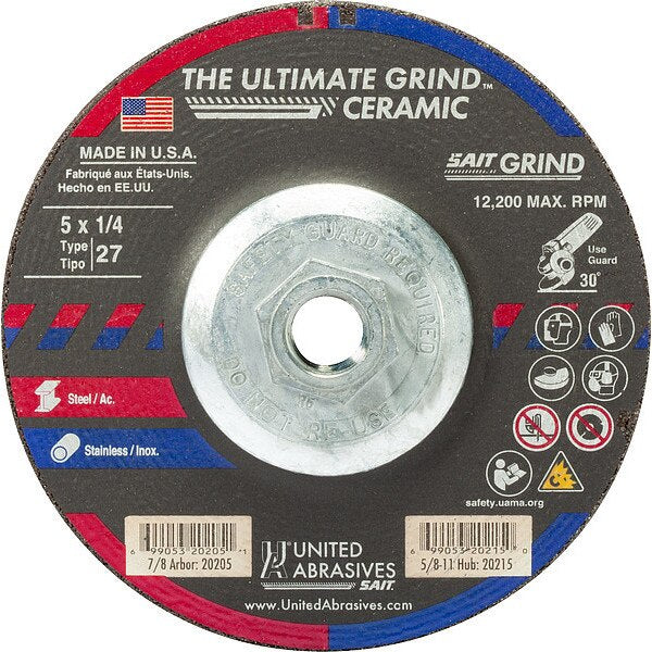 SKU G609753830Categories Abrasives & PolishersDescription Abrasive Grinding Wheel, Abrasive Material Ceramic, Connector Size 5/8 In.-11, Connector Type Threaded Hole, Grit 24, Overall Diameter 5 in, Overall Thickness 0.25 in, Primary Material Applicationn Stainless Steel, Steel, Compatible Tool Type Angle Grinder, Series Ultimate Grind Ceramic, Wheel Type Type 27graingerSKU: , mscSKU: , zoro_no: G609753830, mongo_id: 65bbe9f322d7a989a99881f7