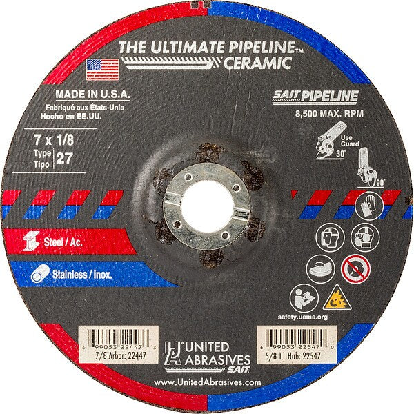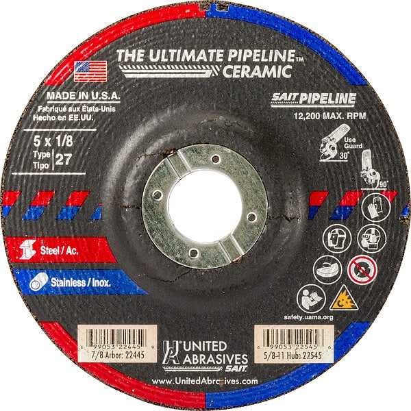 SKU G709753822Categories Abrasives & PolishersDescription Abrasive Grinding Wheel, Abrasive Material Ceramic, Connector Size 7/8 in, Connector Type Unthreaded Hole, Grit 24, Overall Diameter 5 in, Overall Thickness 0.125 in, Primary Material Applicationn Stainless Steel, Steel, Compatible Tool Type Angle Grinder, Series The Ultimate Pipeline Ceramic, Wheel Type Type 27graingerSKU: , mscSKU: , zoro_no: G709753822, mongo_id: 65bbe90e22d7a989a9931e65