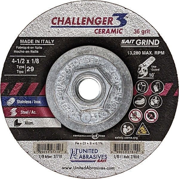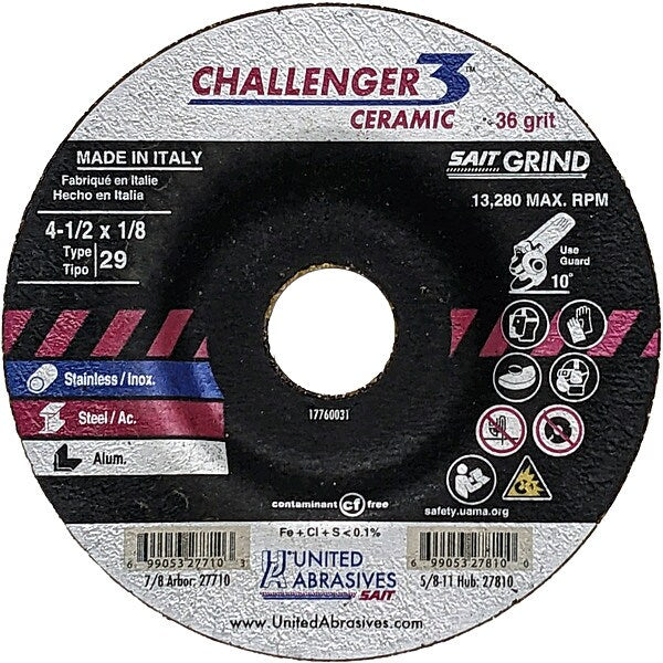 SKU G309753833Categories Abrasives & PolishersDescription Abrasive Grinding Wheel, Abrasive Material Ceramic, Connector Size 7/8 in, Connector Type Unthreaded Hole, Grit 36, Overall Diameter 4 1/2 in, Overall Thickness 0.125 in, Primary Material Applicationn Aluminum, Brass, Copper, Stainless Steel, Steel, Compatible Tool Type Angle Grinder, Series Challenger 3 Ceramic, Wheel Type Type 29graingerSKU: , mscSKU: , zoro_no: G309753833, mongo_id: 65bbe87822d7a989a98f8a12