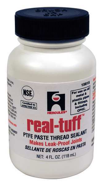 Real Tuff[TM] PTFE Thread Sealant, WhiteSKU G7500726Categories Adhesives, Epoxy & SealantsDescription Pipe Thread Sealant, Cure Type Non-Hardening, Series Real Tuff, Container Size 4.8 fl oz, Container Type Brush-Top Can, Maximum Operating Temperature 550 Degrees F, Minimum Operating Temperature -200 Degrees F, Maximum Operating Pressure for Gases 2,600 psi, Maximum Operating Pressure for Liquids 12,000 psi, Color White, For Fluid Type Air, Alcohol, Butane, Diesel Fuel Oil, Fuels, Kerosene, Petroleum, Natural Gas, Propane, Steam, WatergraingerSKU: 20CM11, mscSKU: , zoro_no: G7500726, mongo_id: 65bbe82a22d7a989a98dd391