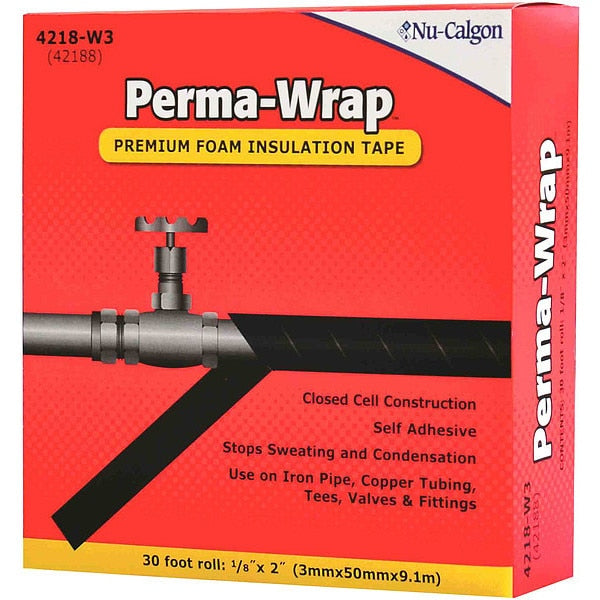 SKU G410133272Categories Adhesives, Epoxy & SealantsDescription Liner Included Yes, Tape Brand Nu-Calgon, Common Industry Plumbing & HVAC, Imperial Tape Length 30 ft, Imperial Tape Width 2 in, Maximum Tape Performance Temperature 200 Degrees F, Minimum Tape Performance Temperature -40 Degrees F, Continuous Roll, Series Perma Wrap, Surface Compatibility Metal, Tape Adhesive Material Acrylic, Premium Closed Cell Foam Tape, Metric Tape Length 9.1 m, Metric Tape Width 50 mm, Standards ASTM C177, ASTM D412-Die A, ASTM D624-Die C, Tape Backing Construction Foam$32.06 / eachWeb price