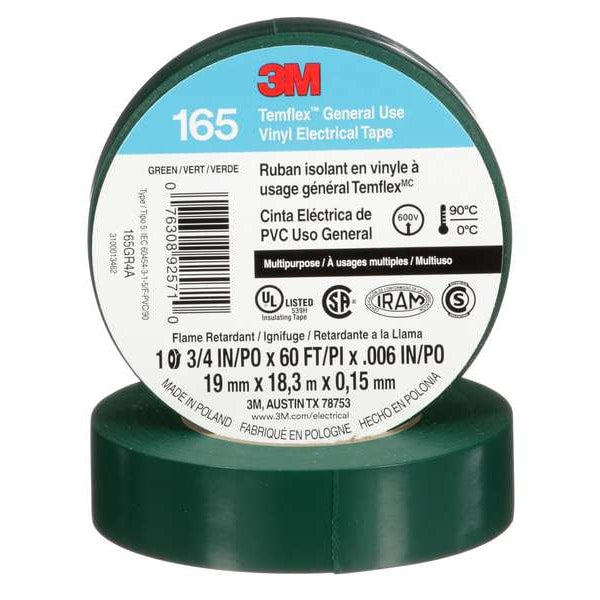 SKU G703510063Categories Adhesives, Epoxy & SealantsDescription Insulating Electrical Tape, General Purpose, Vinyl, Tape Adhesive Material Rubber, 3/4 in, 60 ft, 6 mil, 3M(TM), Temflex(TM), Series 165, Green, Minimum Tape Performance Temperature 32 Degrees F, Maximum Tape Performance Temperature 194 Degrees F, Voltage Rating 600 V, Continuous Roll, Single-SidedgraingerSKU: 61CF59, mscSKU: , zoro_no: G703510063, mongo_id: 65bbe6763aaddbd5a902f978