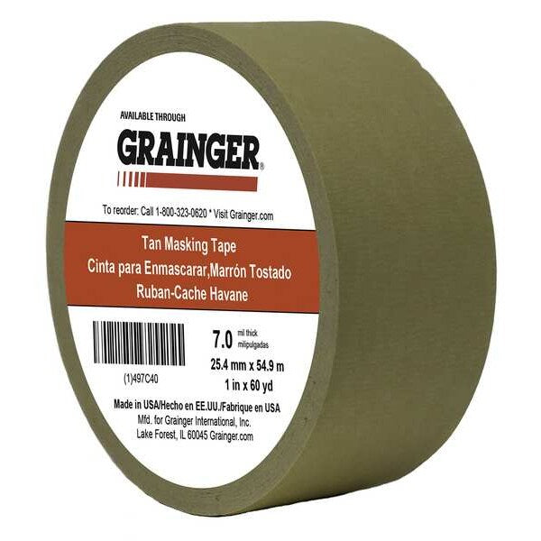 $9.63 / eachWeb priceMasking Tape, Paper, TanSKU G5778439Categories Adhesives, Epoxy & SealantsDescription Adhesion to Steel 40 oz/in, Tape Brand Approved Vendor, Clean Removal Time Not Rated, Common Industry Assembly & Manufacturing, Automotive, Aviation, Metalworking, Warehouse, Indoor Only, Imperial Tape Length 60 yd, Imperial Tape Width 1 in, Maximum Tape Performance Temperature 225 Degrees F, Minimum Tape Performance Temperature 30 Degrees F, Continuous Roll, Series TC450graingerSKU: , mscSKU: , zoro_no: G5778439, mongo_id: 65bbe85f9a749db82278a612