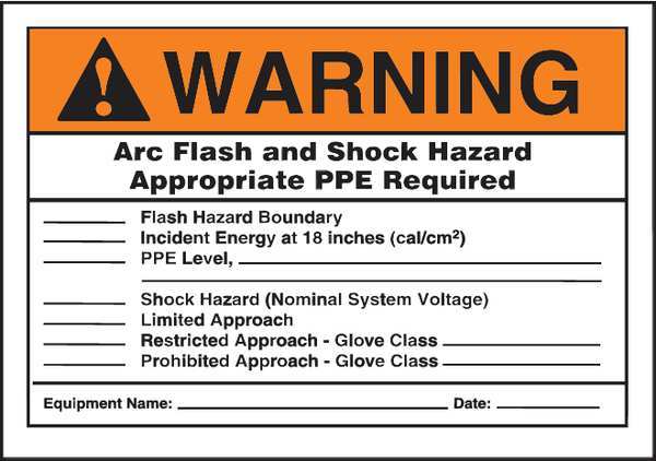 Warning Label, Arc Flash, 7x10 in, Adhesive Dura-VinylSKU G2684337Categories Adhesives, Epoxy & SealantsDescription Arc Flash Label, Vertical Rectangle, Number of Printed Sides 1, English, Sign Format ANSI/OSHA Format, Sign Legend Arc Flash And Shock Hazard Appropriate Ppe Required ___ Flash Hazard Boundary ___ Incident Energy At 18 Inches (Cal/Cm2) ___ Ppe Level ___ Shock Hazard (Nominal System Voltage) __ Limited Approach ___ Restricted Approach - Glove Class ___ Prohibited Approach - Glove Class, Sign Legend Background Color White, Sign Legend Style TextgraingerSKU: 36A931, mscSKU: , zoro_no: G2684337, mongo_id: 65bbe5c93aaddbd5a9fe7a75
