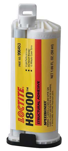 Acrylic Adhesive, H8000 Series, Green, 10:01 Mix Ratio, 30 min Functional Cure, Dual-CartridgeSKU G6075237Categories Adhesives, Epoxy & SealantsDescription Acrylic Adhesive, Compatible Applicator 1034026, Compatible Mixer Tip 1034575, Container Type Dual-Cartridge, Cure Method Ambient, Cured Color Green, Features High Bond Strength, Environmental Resistant, Fast Fixture Time, Little or No Surface Preparation, Rapid Room Temperature Cure, High Impact Strength, High Peel Strength, For Use With Applicator, Mixing Tip, Included Components Resin and Hardener, Interior/Exterior Interior Only, Low Odor No, Marine Grade No$49.69 / eachWeb price -