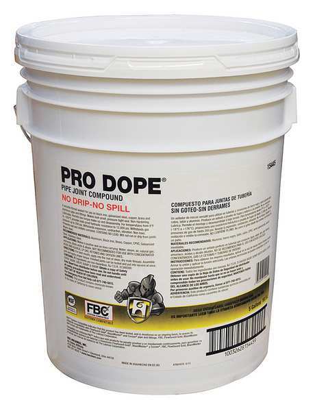 Pro Dope[R] Thread Sealant, 5 gal., GraySKU G8296504Categories Adhesives, Epoxy & SealantsDescription Pro Dope(R) Thread Sealant, Container Size 5 gal, Container Type Pail, Maximum Operating Temperature 350 Degrees F, Minimum Operating Temperature 0 Degrees F, Maximum Operating Pressure for Gases 200 psi, Maximum Operating Pressure for Liquids 250 psi, Color Gray, For Fluid Type Air, Natural Gas, Steam, Water, For Material Type Aluminum, Black Iron, Brass, Copper, Galvanized Steel, Stainless Steel, Specific Sealing Application General Purpose Thread SealinggraingerSKU: 20CM09, mscSKU: , zoro_no: G8296504, mongo_id: 65bbe73d3aaddbd5a9082d7e
