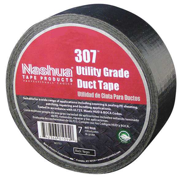 Duct Tape, 48mm x 55m, 7 mil, BlackSKU G4719224Categories Adhesives, Epoxy & SealantsDescription Tape Thickness 7 mil, Tape Brand Nashua, Common Industry Assembly & Manufacturing, Construction, General Maintenance & Repair, Metalworking, Warehouse, Indoor and Outdoor, Imperial Tape Length 60 yd, Imperial Tape Width 1 7/8 in, Maximum Tape Performance Temperature 200 Degrees F, Minimum Tape Performance Temperature 40 Degrees F, Continuous Roll, Series 307, Tape Backing Material Polyethylene Coated Cloth, Tape Adhesive Material Rubber, Tape Sub-Type General Purpose Duct TapegraingerSKU: 30F044, mscSKU: , zoro_no: G4719224, mongo_id: 65bbea5222d7a989a99a8ccd