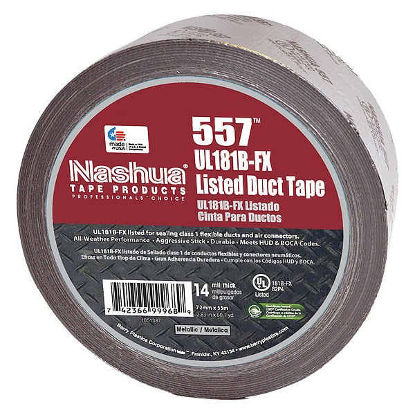 Duct Tape, 72mm W, 55m L, Premium, SilverSKU G3036864Categories Adhesives, Epoxy & SealantsDescription Tape Thickness 14 mil, Tape Brand Nashua, Common Industry Assembly & Manufacturing, Construction, General Maintenance & Repair, Metalworking, Warehouse, Indoor and Outdoor, Imperial Tape Length 60 yd, Imperial Tape Width 2 13/16 in, Maximum Tape Performance Temperature 200 Degrees F, Minimum Tape Performance Temperature 40 Degrees F, Continuous Roll, Series 557, Tape Backing Material Polyethylene Coated Cloth, Tape Adhesive Material Rubber, Tape Sub-Type UL-Printed Duct Tape, Duct & Repair TapegraingerSKU: 6JD47, mscSKU: , zoro_no: G3036864, mongo_id: 65bbea5222d7a989a99a8cce
