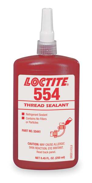 SKU G3471273Categories Adhesives, Epoxy & SealantsDescription Pipe Thread Sealant, Cure Type Anaerobic, Series 554, Container Size 8.5 fl oz, Container Type Bottle, Maximum Operating Temperature 300 Degrees F, Minimum Operating Temperature -65 Degrees F, Maximum Operating Pressure for Liquids 10,000 psi, Color Red, For Material Type Steel, Specific Sealing Application For Refrigeration, Standards ISO 10964, ISO 8302, Application Method Brush, Chemical Base Methyl Methacrylate, Clean Up Method Loctite Solvent, Compatible Primer Series 7088, 7471, 7649graingerSKU: 1YDZ4, mscSKU: , zoro_no: G3471273, mongo_id: 65bbea4a22d7a989a99a603c