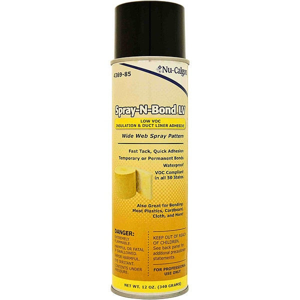 SKU G610133393Categories Adhesives, Epoxy & SealantsDescription Spray Adhesive, Adhesive Color Clear, Container Size 12 oz, Container Type Aerosol Can, Product Type Spray Adhesive, Series Spray-N-Bond, Spray Pattern Web, Features 4369-85 Meets or Exceeds California VOC Limits, Non-Chlorinated and Non-Ozone Depleting, Temporary or Permanent Bonds, High Tack Yes, Standards OSHA 29 CFR 1910.1200, Water Resistance Waterproof, Primary Applications Cardboard, Cloth, Duct Liner, Leather, Most Plastics$14.49 / eachWeb price