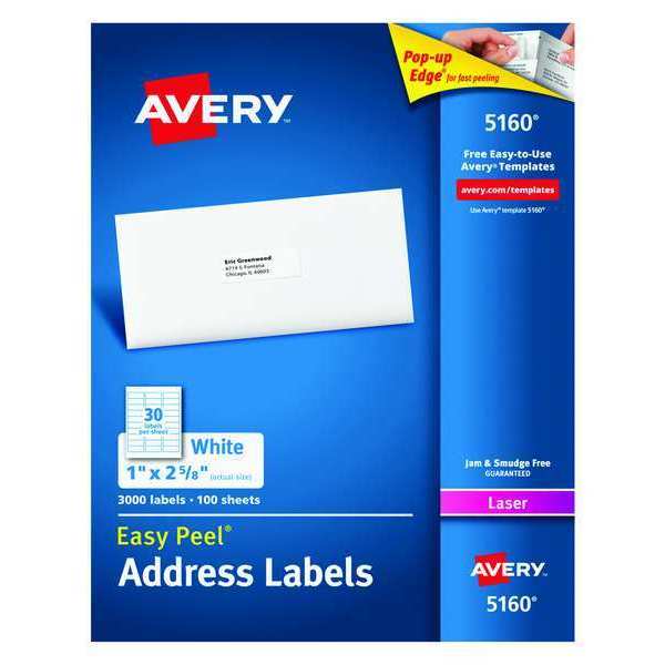 Avery® Easy Peel® Address Labels, Permanent Adhesive, 1" x 2-5/8", 3, 000 Labels (5160)SKU G2469503Categories Adhesives, Epoxy & SealantsDescription Laser Label, Avery Template Number 5,160, For Use With Laser, Label Height 1 in, Label Width 2 5/8 in, Color White, Permanent Adhesive, Material Paper, Laminated No, Labels per Sheet 30, Total Number of Labels 3,000, Recycled Content 0 PercentgraingerSKU: , mscSKU: , zoro_no: G2469503, mongo_id: 65bbe9cb22d7a989a9979703
