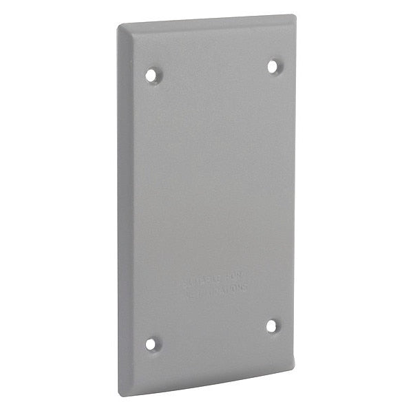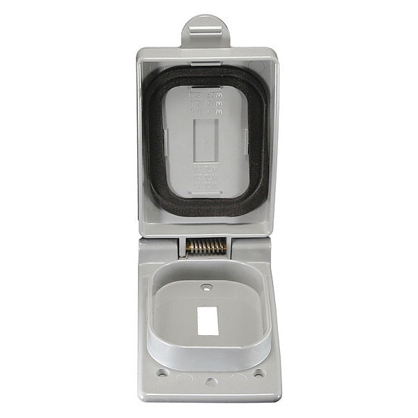 Description Weatherproof Cover, Mounting Box FS or FD Weatherproof Boxes, For Use With On-Off Type Switches, Mounting Orientation Vertical, Lid Style No Lid, Number of Gangs 1, Gasket Material Neoprene, Cover Material Die-Cast Zinc, Color Gray, Height 4 1/2 in, Width 2 3/4 in, Depth 1 37/64 in, NEMA Rating 3R, Standards UL and CSA, Includes Installation Hardware and Gasket, Toggle Single Pole 125V/10A Switch