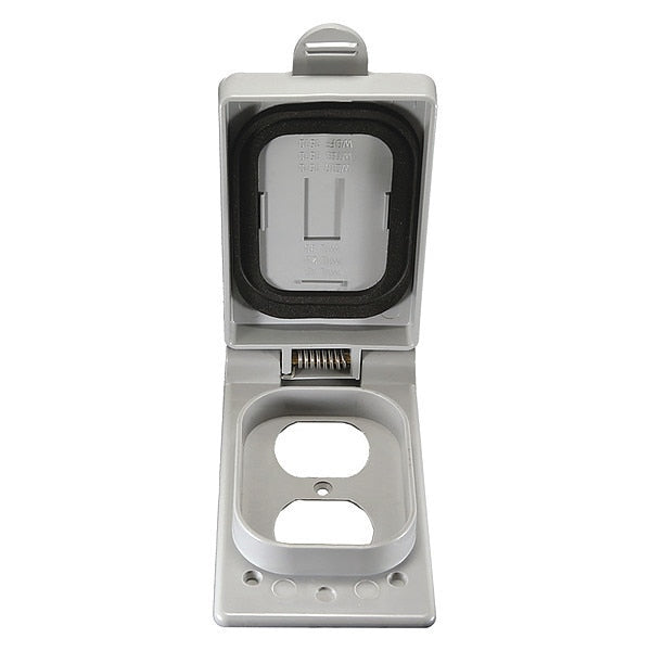 Description Weatherproof Cover, Mounting Box FS or FD Weatherproof Boxes, For Use With Outdoor Receptacles, Mounting Orientation Vertical, Lid Style Self Closing, Number of Gangs 1, Gasket Material Neoprene, Cover Material Die-Cast Aluminum, Color Gray, Height 4 1/2 in, Width 2 3/4 in, Depth 1 in, NEMA Rating 3R, Standards UL and CSA, Includes Mounting Screws and Gasket
