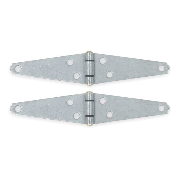 Description Strap Hinge, Steel Material, Galvanized Steel Finish, With Holes, 3 Holes per Leaf, No Ligature Resistant, 270 Degrees Range of Motion, Orientation Non Handed, 4 in Door Leaf Height, 4 in Frame Leaf Height, 1 1/2 in Door Leaf Width, 1 15/16 in Frame Leaf Width, 0.075 in Door Leaf Thickness, 0.075 in Frame Leaf Thickness, Plain Bearing Type, Rounded Corners, Included Hardware, Full Surface Mounting, Steel Pin Material, Nonremovable Pin Type, Hole Size 0.25 in