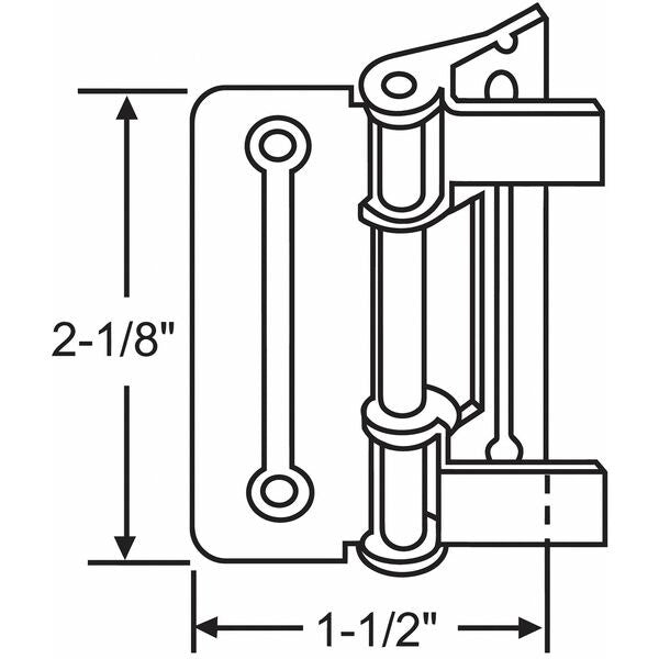 Description Bifold Door Hinge, Steel, Yellow Zinc Finish, 30 lb Load Capacity, With Holes, 2 Holes per Leaf, No Ligature Resistant, 160 Degrees Range of Motion, Orientation Non Handed, 2 1/8 in Door Leaf Height, 2 1/8 in Frame Leaf Height, 1 1/2 in Door Leaf Width, 1 1/2 in Frame Leaf Width, 0.06 in Door Leaf Thickness, 0.06 in Frame Leaf Thickness, 7/8 in Required Door Thickness, Plain Bearing Type, Rounded Corners, Included Hardware