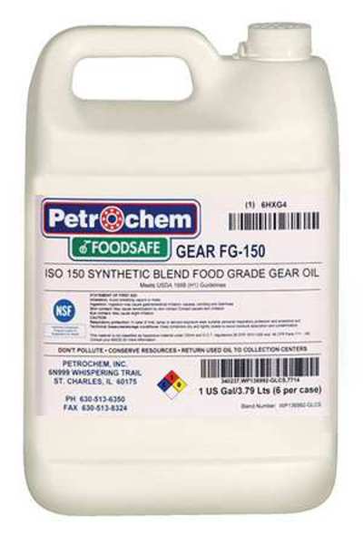 Description Synthetic GearSynthetic Gear Oil ISO 150, Container Type Plastic Bottle, Size 1 gal.SAE Grade 85W, Viscosity Index Greater Than 150, ISO Viscosity Grade 150Temp. Range -40 Degrees F to 450 Degrees F (-40 Degrees C to 232 Degrees C)Food Grade, Spur Gear, Helical, Herringbone, Rack And Pinion, Straight Bevel, Spiral Bevel, Worm Gears (E.P.), Chain Drive, Circulating Systems, High Temperature Chains, Oil Lubricated Bearings, Gear Boxes., H1