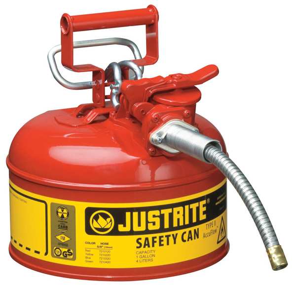 1 gal. Red Steel Type II Safety Can for FlammablesSKU G1726733CategoriesDescription Type II Safety Can, Can Type Type II, DOT Approved No, Capacity 1 gal, Compatible Fluids Flammables, Color Red, Can Material Steel, Material Finish Powder Coated, Hose Outside Diameter 5/8 in, Included Hose/Funnel Flexible Hose, Can Diameter 9 1/2 in, Overall Height 10 1/2 in, Includes Faucet No, Faucet Channel Diameter Not Applicable, Overall Width Not Applicable, Cap Features Automatic Positive-Pressure Relief Vent, Leakproof, Self-Closing, Footprint Shape Circle, Hose Length 9 ingraingerSKU: 3NKT5, mscSKU: 74186214, zoro_no: G1726733, mongo_id: 65bbe7793aaddbd5a9099280