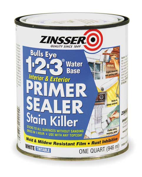 SKU G2671365CategoriesDescription Primer/Sealer, Coating Application Stain Blocking Primer/Sealer, Color Family White, Compatible Surface Material Aluminum, Concrete, Cured Plaster, Drywall, Masonry, Metal, PVC, Steel, Stucco, Vinyl, Wood, Sheen Flat, Resin Type Styrenated Acrylic, Color White, Container Size 1 qt, Coverage Area 350 to 450 sq ft/gal, Base Type Water, Dry Time 1 hr, Use Location Exterior, Interior, Sub Brand Bulls Eye 1-2-3, Application Method Brush, Roller, Spray, Dry Time Tack Free 30 mingraingerSKU: null, mscSKU: null, zoro_no: G2671365, mongo_id: 65bbe6243aaddbd5a900e4ea