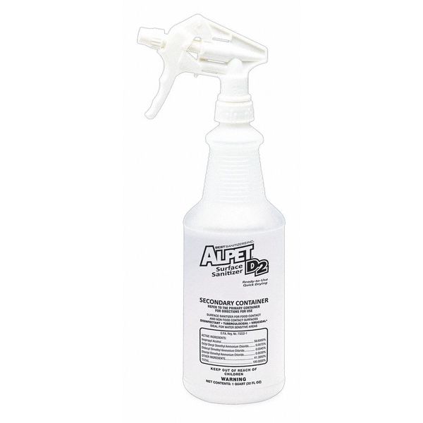 1 qt. Clear, Plastic Secondary Container, 12 PackSKU G5035283CategoriesDescription Trigger Spray Bottle, Dispensing Type Stream, 32 oz, Clear, Sprayer Color White, Bottle Material Plastic, Sprayer Material Plastic, Dip Tube Length 9 1/2 in, Imprinting Alpet D2 Surface Sanitizer, Graduation Markings No, Overall Height 10 in, Closure Size 28/400, Compatible Grainger Part Number 36P184, 36P185, Compatible Mfg. Model Number SS10002; SS10001, (12) Trigger Sprayers, Standards EPA Registered, Halal, Kosher, NSF Rated, Pareve, Closure Diamenter 28 mm, Closure Thread Style 400graingerSKU: 36P187, mscSKU: , zoro_no: G5035283, mongo_id: 65bbea1f22d7a989a9997d3d