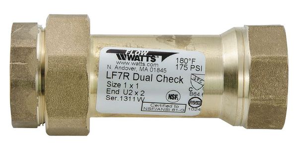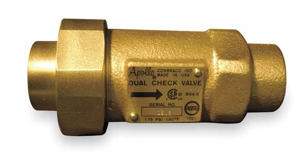 Description Item - Check Valves Check Valve, Flow Design Dual, Mechanism and Body Design Inline, Body Material - Valves Bronze, Pipe or Tube Size 1 in, Connection Type FNPT x FNPT, Max. Temp. - Valves 180 Degrees F, Max. Steam Pressure - Valves Not Rated, Application - Valves General Purpose, Length 3 7/8 in, Standards ANSI / ASSE STANDARD 1024