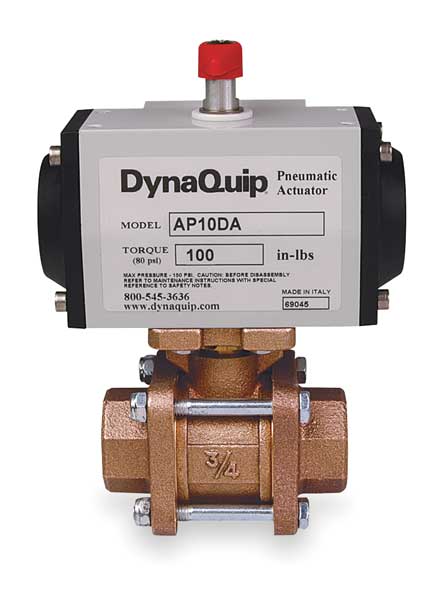 Description Pneumatic Actuated Ball Valve, Body Material Bronze, Body Style Inline, Valve Structure 3-Piece, Pipe Size 1 in, Connection Type FNPT, Full Port, Max. Pressure 600 psi CWP, Required Pressure 80 psi, Max. Inlet Pressure 300 psi, Temp. Range -4 Degrees to 176 Degrees F, Ball Material 316 Stainless Steel, Seat Material PTFE, Stem Material Stainless Steel, Body Seal Material PTFE/Viton, Standards NEMA 4X