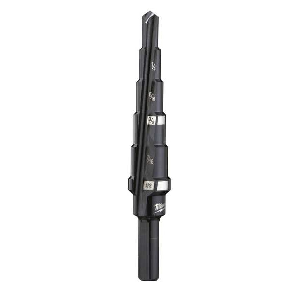 SKU G7461937CategoriesDescription Step Drill Bit, High Speed Steel, Black Oxide, 3/16 in to 1/2 in Size Range, Straight with Three Flats, 1/4 in Shank Diameter, 3 1/16 in Overall LengthgraingerSKU: 19RK73, mscSKU: 40482168, zoro_no: G7461937, mongo_id: 65bbe89622d7a989a9903e7a