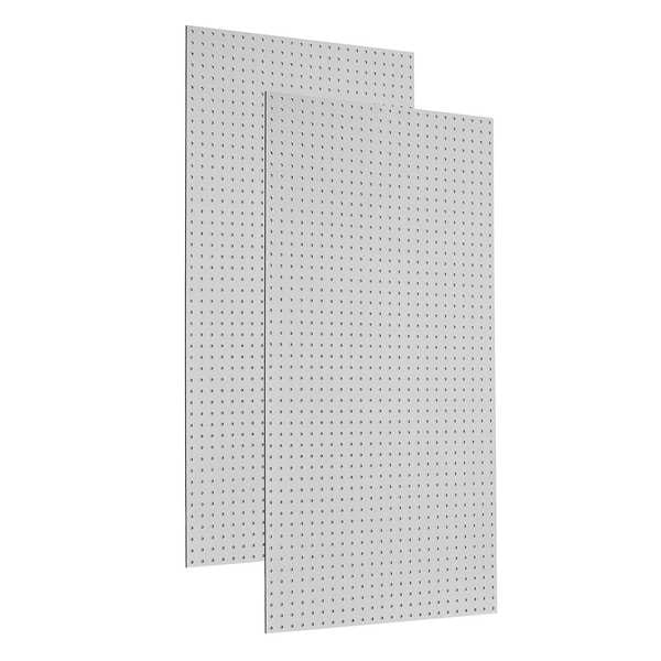 Description Pegboard Panel, Peg Hole Shape Round, Peg Hole Size 1/4 in, Peg Hole Spacing 1 in, Panel Pegboard Type, 25 lb Panel Load Capacity, Overall Depth 1/8 in, Overall Height 48 in, Overall Width 24 in, Storage Area 16 sq ft, Number of Usable Sides 1, Number of Hooks 0, Number of Panels 2, 50 lb Whole Unit Load Capacity, White, Painted, High-Density Fiberboard, Includes Mounting Hardware No, Mounting Hardware Required Yes, Wall Mount Mounting Type, Package Quantity 2