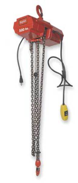 $1,661.24 / eachWeb priceElectric Chain Hoist, 800 lb, 10 ft, Hook Mounted - No Trolley, RedSKU G1236864Categories Electric and Cordless ToolsDescription Electric Chain Hoist, Duty Classification H2, Mount Type Hook Mounted - No Trolley, Maximum Lifting Capacity 800 lb, Number of Speeds 1, Fixed Lift Speed 7 fpm, Minimum Lift Speed Not Applicable, Maximum Lift Speed Not Applicable, Trolley Speed 10, Maximum Lifting Length 10 ft, Current at Minimum Voltage 3 A, Current at Maximum Voltage 3 A, Motor Horsepower 1/4 hp, Operating Voltage 115V AC, Headroom 16 3/4 in, For Minimum Beam Height Not Applicable, For Maximum Beam Height Not ApplicablegraingerSKU: 4ZY98, mscSKU: , zoro_no: G1236864, mongo_id: 65bbe7a09a749db8227499d6