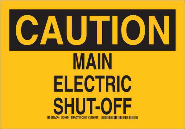 SKU G7407010Categories Electric and Cordless Tools , SafetyDescription Caution Sign, Sign Subject Matter Electrical Hazard, Height 7 in, Width 10 in, Sign Material Aluminum, Header Caution, Legend Main Electric Shut-Off, Printed Language English, Sign Shape Rectangle$19.06 / eachWeb priceCaution Sign, 7X10", Black/Yellow, Legend: Main Electric Shut-OffSKU G7407010Categories Electric and Cordless Tools , SafetyDescription Caution Sign, Sign Subject Matter Electrical Hazard, Height 7 in, Width 10 in, Sign Material Aluminum, Header Caution, Legend Main Electric Shut-Off, Printed Language English, Sign Shape Rectangle$19.06 / eachWeb price -