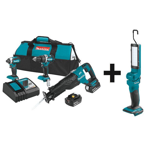 SKU G9222611Categories Electric and Cordless ToolsDescription Cordless Combination Kit, Cordless Tools Included Flashlight, Hammer Drill, Impact Driver, Reciprocating Saw, Voltage 18 V, Power Source Cordless, Number of Tools 4, Battery Capacity (2) 4.0 Ah, Includes (2) Batteries, Charger, Contractor Bag, Tool Brand Makita, Series 18V LXT, Battery Included (2) 33RT43, Mfr. No. BL1840B, Number of Batteries Included 2, Battery Model No. (2) Mfr. No. BL1840B, Battery Series 18V LXT, Charger (1) Mfr. No. DC18RC, Charger Included YesgraingerSKU: 327EN4, mscSKU: , zoro_no: G9222611, mongo_id: 65bbe75b9a749db822732586