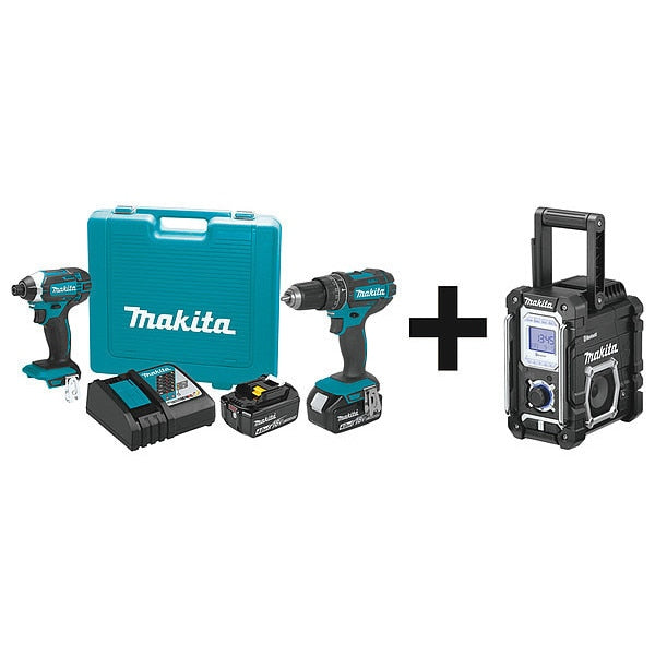 Cordless Combination Kit, 3 Tools, 18V DCSKU G9221945Categories Electric and Cordless ToolsDescription Cordless Combination Kit, Cordless Tools Included Hammer Drill, Impact Driver, Radio, Voltage 18 V, Power Source Cordless, Number of Tools 3, Battery Capacity (2) 4.0 Ah, Includes A/C Adaptor, Tool Brand Makita, Series 18V LXT, Battery Included (2) 33RT43, Mfr. No. BL1840B, Number of Batteries Included 2, Battery Model No. (2) Mfr. No. BL1840B, Battery Series 18V LXT, Charger (1) Mfr. No. DC18RC, Charger Included Yes, Cordless Tool Kit Contents (3) Bare Tools, (2) Batteries, (1) ChargergraingerSKU: 327DZ4, mscSKU: , zoro_no: G9221945, mongo_id: 65bbee24526e052139af150f