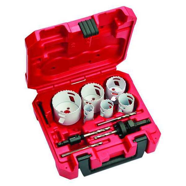 HOLE DOZER Electricians Hole Saw Kit - 10PCSKU G0816392Categories Electric and Cordless ToolsDescription Hole Saw Kit, Primary Material Application Metal, Materials Cut Metal, Plastics & Composites, Wood, Arbor Design Included, Tooth Material High Speed Steel, Teeth per Inch 4, Max. Cutting Depth 1 5/8 in, Impact Rated No, Number of Hole Saws 6, Saw Size Range 7/8 in to 2 1/2 in, Hole Saw Sizes (Hole Saws) 7/8 in, 1 1/8 in, 1 3/8 in, 1 3/4 in, 2 in, 2 1/2 in, Thread Size 1/2 In.-20, 5/8 In.-18, Shank Size 3/8 in Hex, 7/16 in Hex, Pilot Drill Size 1/4 in dia x 3 1/2 in L, Number of Pieces 11graingerSKU: 3EJD7, mscSKU: 86041241, zoro_no: G0816392, mongo_id: 65bbe97a22d7a989a9959fa2