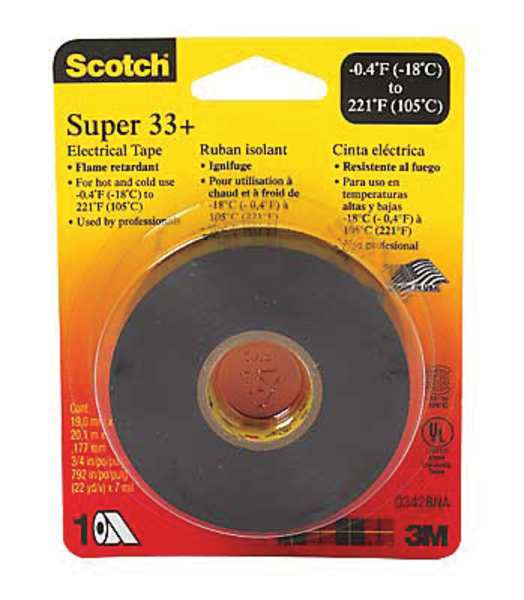 SKU G5622224Categories Adhesives, Epoxy & Sealants , Electric and Cordless ToolsDescription Insulating Electrical Tape, General Purpose, Vinyl, Tape Adhesive Material Rubber, 1 1/2 in, 44 ft, 7 mil, 3M(TM), Scotch(R), Series Super 33+, Black, Minimum Tape Performance Temperature 0 Degrees F, Maximum Tape Performance Temperature 221 Degrees F, Voltage Rating 600 V, Continuous Roll, Single-Sided, Package Quantity 100graingerSKU: 2FYL6, mscSKU: , zoro_no: G5622224, mongo_id: 65bbe96a22d7a989a99529d1