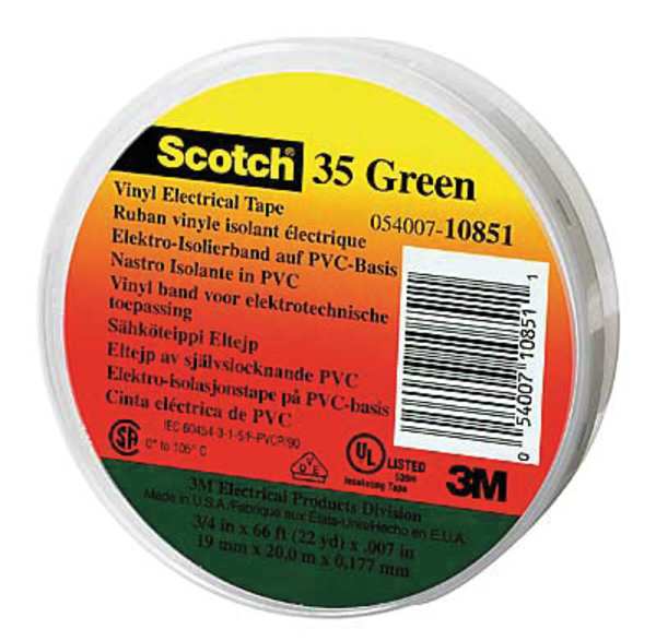 SKU G4330383Categories Adhesives, Epoxy & Sealants , Electric and Cordless ToolsDescription Insulating Electrical Tape, General Purpose, Vinyl, Tape Adhesive Material Rubber, 1/2 in, 20 ft, 7 mil, 3M(TM), Scotch(R), Series 35, Green, Minimum Tape Performance Temperature 32 Degrees F, Maximum Tape Performance Temperature 221 Degrees F, Voltage Rating 600 V, Continuous Roll, Single-Sided, Package Quantity 100graingerSKU: 2JKY7, mscSKU: , zoro_no: G4330383, mongo_id: 65bbe8f722d7a989a9927919
