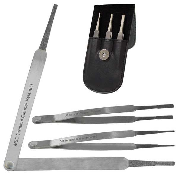 Diamond-Tip Electrical Terminal CleanersSKU G4569022Categories Electric and Cordless ToolsDescription Light Socket Brush Kit, Tool Type Terminal Cleaner tweezers, Length 6 in, Width 3 in, Height 3/4 in, Material Brass, Steel, For Vehicle Tool Category Terminal Cleaner, Color Silver, Includes Large, Leather Pouch, Medium, Small, Number of Pieces 4, Application Male and Female Connectors On Flat (Spade) Pin Terminals, For Use With 1156-1157 Type Light Bulb Sockets, 5/8 in to 3/4 in BoresgraingerSKU: 18M470, mscSKU: , zoro_no: G4569022, mongo_id: 65bbe8ef22d7a989a992403f