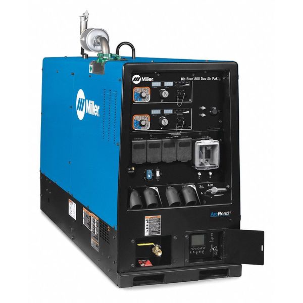 Engine Driven Welder, Big Blue(R) 800 Duo Air Pak(TM) Series, Electric Start, 65.7 hp, DieselSKU G1614188Categories Electric and Cordless ToolsDescription Engine-Driven Welder, For Material Type Stainless Steel, Steel, Generator Fuel Type Diesel, MIG Welding Maximum Output Current 800 A, MIG Welding Output @ Duty Cycle 400 A @ 34 V, 100 Percent (Separate), 750 A @ 40 V, 100 Percent (Combined), 800 A @ 38 V, 100 Percent (Combined), Phase Three-Phase, Polarity DC, Start Type Electric, Stick Welding Maximum Output Current 800 A, Stick Welding Minimum Output Current 20 A (Dual), 40 A (Combined)graingerSKU: 408N13, mscSKU: , zoro_no: G1614188, mongo_id: 65bbe64c3aaddbd5a901ee04
