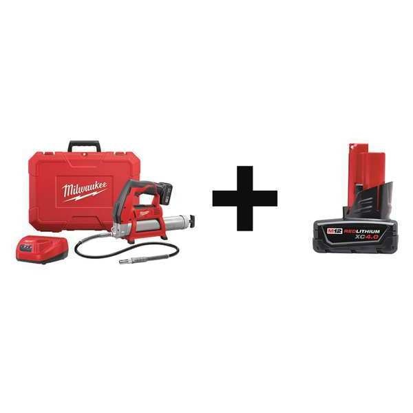 SKU G2612850Categories Electric and Cordless ToolsDescription Cordless Grease Gun Kit, Battery Included, 12 V, Li-Ion, Bulk, Cartridge, Filler Pump, Pistol Grip, Nozzle Extension Type Flex Hose, Strokes per Oz. 38 stroke/oz, Max. Operating Pressure 8,000 psi, Cartridge Capacity 14 1/2 oz, Bulk Capacity 16 oz, Hose Length 36 in, Tube Color Silver, Tube Material Brushed Steel, Volume per Minute 2.6 oz, Tool Length 14 in, Tool Weight 7.2 lb, Grease Type Up to NLGI #2, Battery Capacity 3 Ah, 4 Ah, Number of Speeds 1graingerSKU: , mscSKU: , zoro_no: G2612850, mongo_id: 65bbe6173aaddbd5a900725c