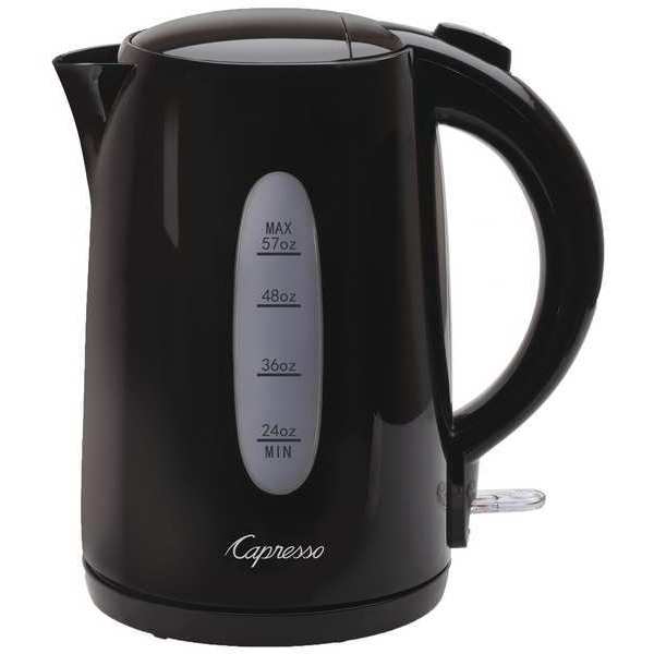 Electric Water Kettle, 57 oz HoldsSKU G900690346Categories Electric and Cordless ToolsDescription Electric Water Kettle, Capacity 1.7 L, Overall Height 9 3/4 in, Overall Width 6 in, Overall Depth 9 in, Color Black, Voltage 120V AC, Material Plastic, Auto Shut-Off Yes, Current 13 A, Features Concealed Low-Noise Heating Element, Cool-Touch Handle and Drip Free Pouring Design, Dry Boil Protection, Locking Lid, Micro Filter Spout, Standards UL Listed, Wattage 1,500 W, Weight 2 lbgraingerSKU: , mscSKU: , zoro_no: G900690346, mongo_id: 65bbe6f63aaddbd5a90668e8